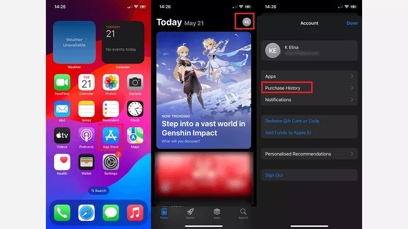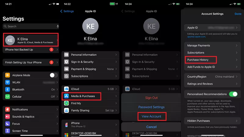 步驟3:在賬戶設置部分,點擊購買記錄並找到任何項目
