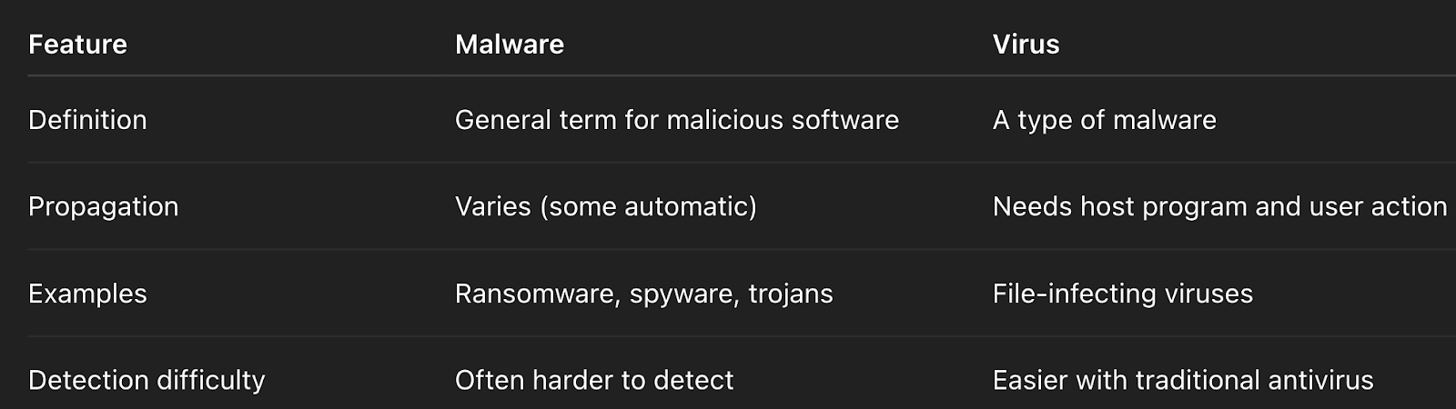 說到惡意軟件和病毒,有必要說病毒是某種形式的惡意軟件,具有自己的行為特徵,包括自我複制和需要用戶交互才能執行。病毒很容易在計算機之間傳播,但通常需要用戶傳輸或打開受感染的文件,但蠕蟲可以在兩台或多台計算機之間傳播,無需任何人為交互。