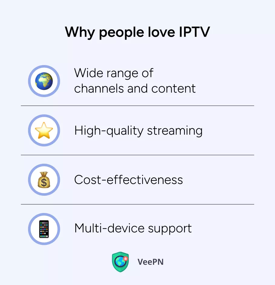 簡單來說,IPTV(互聯網協議電視)是指用戶通過互聯網觀看電視頻道和流媒體內容,而不是老式的有線或衛星服務。通過 IPTV,您可以觀看新聞、體育和電視節目。其他內容可以通過 Wi-Fi 或互聯網連接現場直播到您的電視機。這就是人們喜歡 IPTV 的原因: