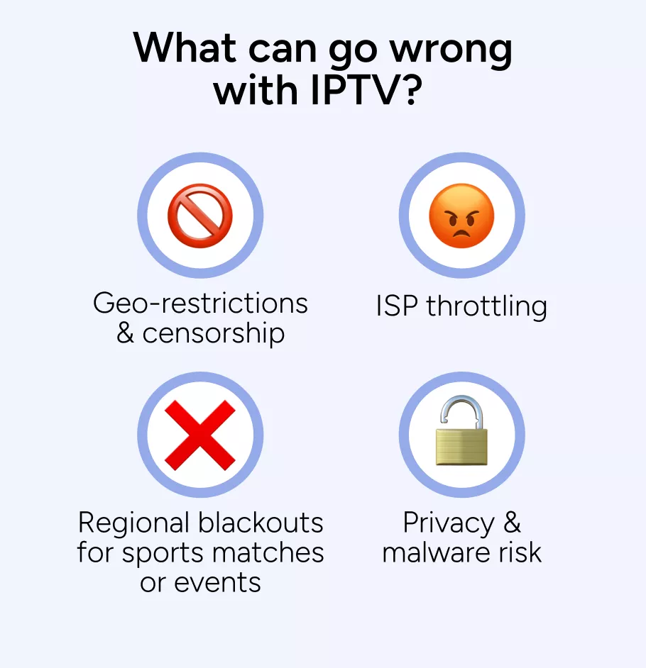 謹防未經驗證或免費的 IPTV 服務。此類服務往往缺乏適當的安全措施,並且如果沒有數據加密,您的觀看習慣、IP 地址、登錄憑據、瀏覽歷史記錄、支付卡詳細信息以及其他信息可能會被黑客竊取。在最好的情況下,您會受到侵入性無意義廣告的轟炸,在最壞的情況下,您的錢會被盜。