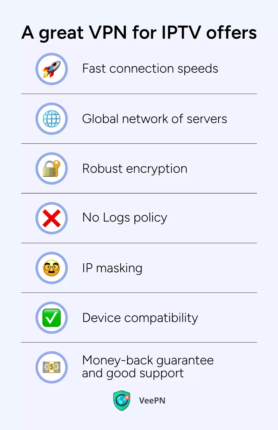 VeePN 滿足您可能尋找的可靠 IPTV VPN 的所有要求。它在 89 個地點擁有 2,500 台服務器,採用高級 AES 256 位加密,以及針對 IPTV 內容安全流進行優化的專用服務器,以節省互聯網速度,並且不會被 IPTV VPN 檢測器服務阻止。它與各種 IPTV 設備兼容,並提供先進的安全功能,例如自動 Kill Switch、Double VPN 和 NetGuard,以始終確保您的連接安全和私密。