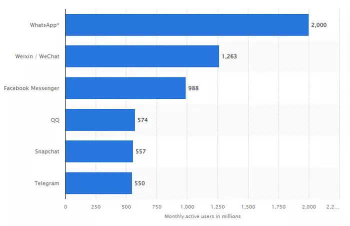 截至 2022 年 1 月,WhatsApp 是最常用的通訊工具,每月有 200 萬用戶訪問它。大多數國家近 90% 的人都在使用它。微信、QQ(中文平台)、Facebook Messenger、Snapchat 和 Telegram 也名列前茅。