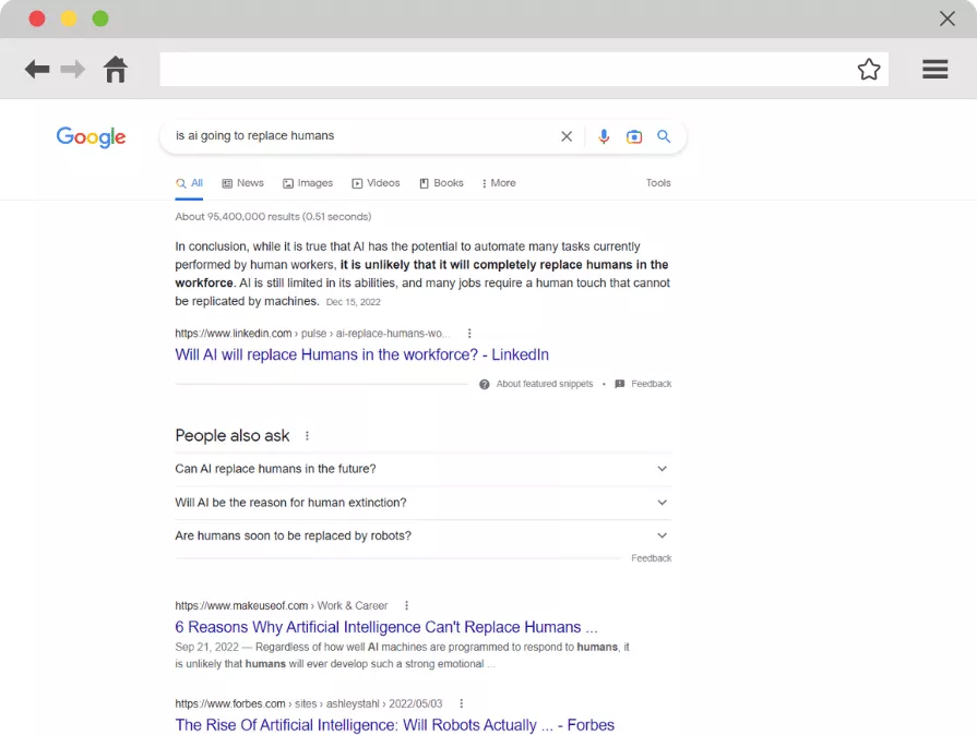 讓我們通過輸入相同的查詢來快速比較兩者 - “AI會取代人類嗎?”
