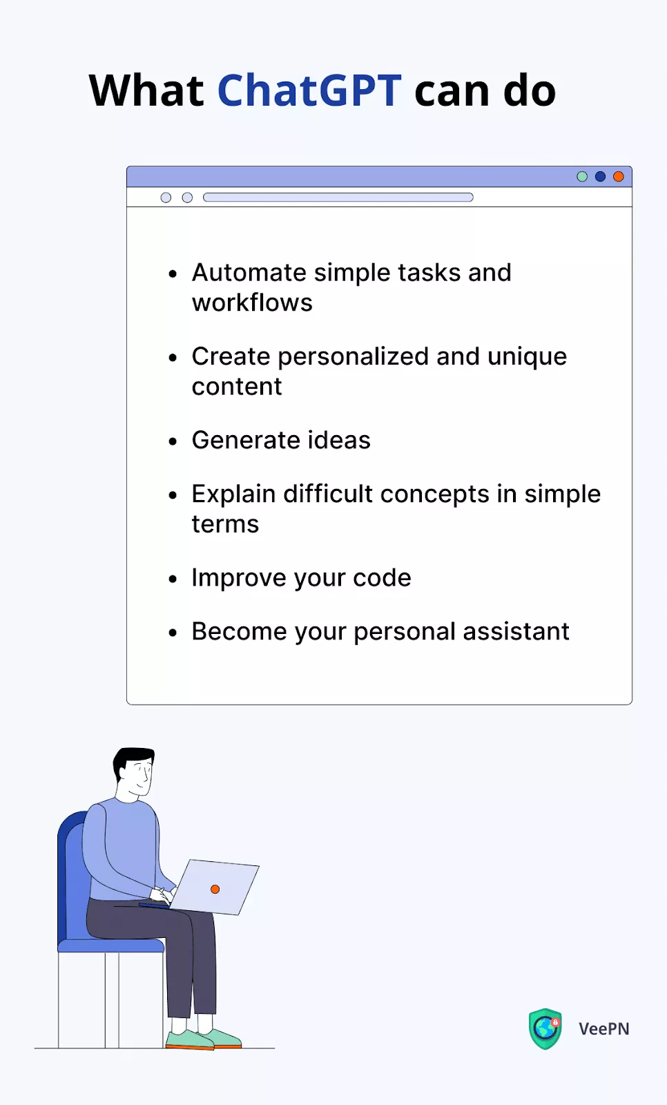 VPN 就像一個秘密隧道,可以保護您的在線活動。可以將 VPN 與 ChatGPT 結合使用,就像給日記上一把鎖一樣。這樣,您就可以保持對話的私密性和安全性,尤其是在共享敏感信息時。說實話,誰不想要這樣呢?