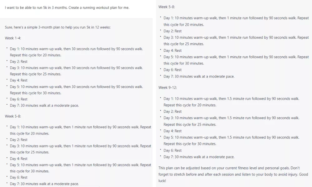 在這裡使用 ChatGPT 就像擁有一位代理私人教練,隨時為您提供定制的鍛煉計劃。當然,在涉及您的健康和健身問題時,始終建議諮詢專業人士。但如果這不可能,嘗試一下 ChatGPT 聽起來也不錯。