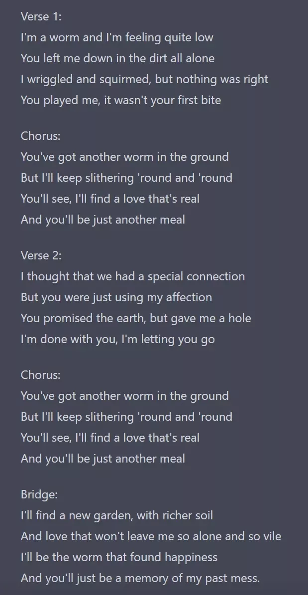 這真是一種享受。 ChatGPT 是任務創作一首帶有轉折的憤怒分手歌曲——從蠕蟲的角度來寫。結果呢?一部讓人肚子疼、心碎的傑作。