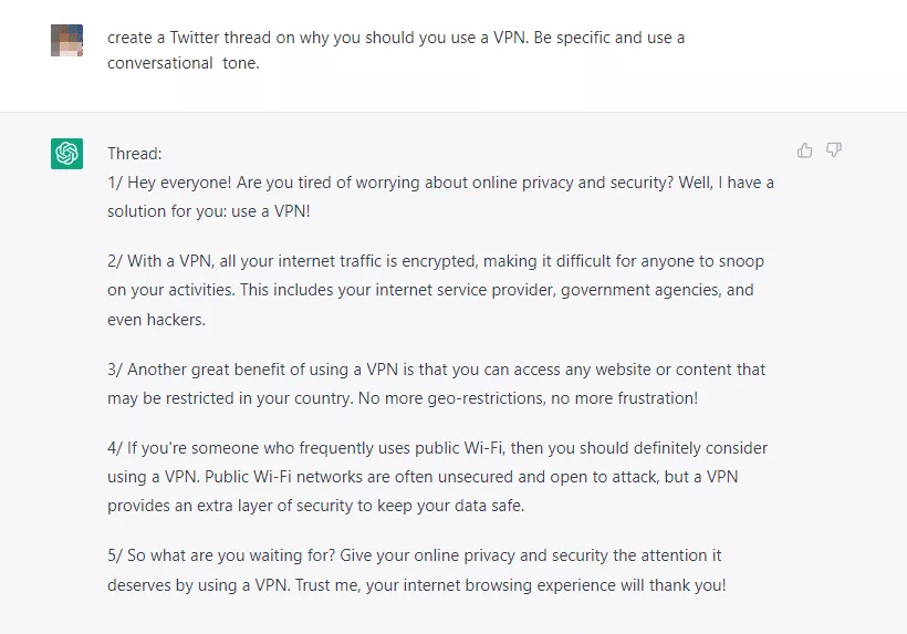 撰寫電子郵件、創建社交媒體帖子、產品描述,甚至撰寫故事或文章從未如此簡單。 ChatGPT 處理每一個寫作提示。例如,我們要求機器人創建一個 Twitter 線程。