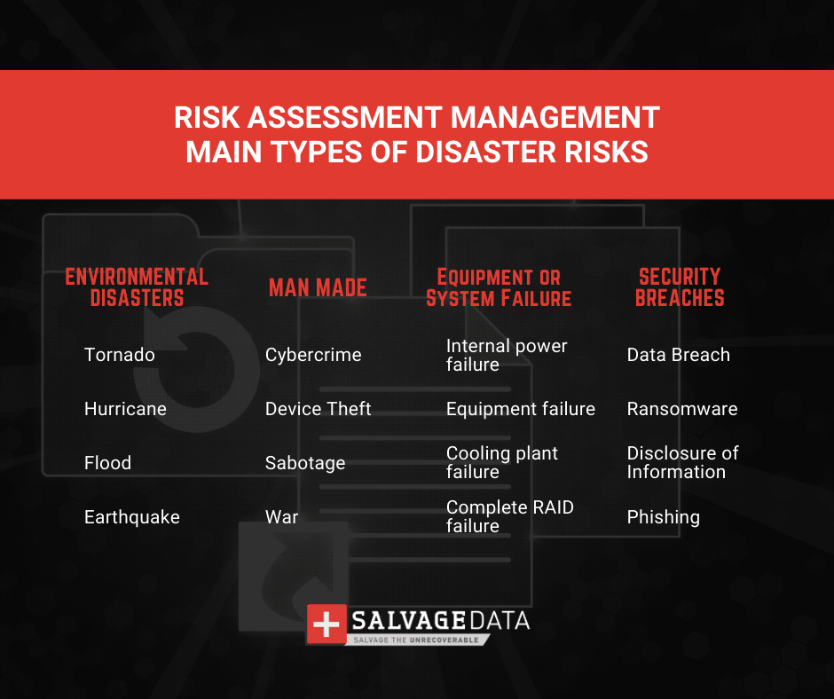 災難恢復規劃過程的很大一部分在於評估組織的潛在風險和威脅。良好的 IT 風險評估必須涉及所有事件類型、其可能性以及每種事件可能對組織繼續提供常規業務服務的能力產生的影響。
