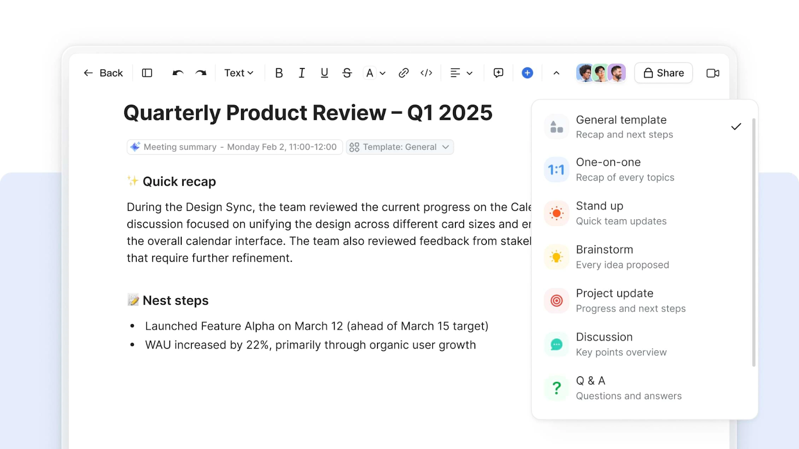 Zoom Docs 使團隊能夠實時工作、自定義佈局並集成 AI 功能,使想法保持井然有序且可操作。這就是它脫穎而出的原因。