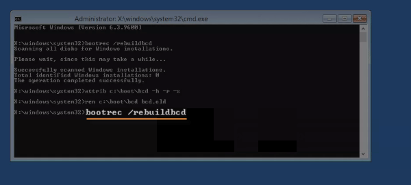 嘗試通過執行以下命令再次重建 BCD,然後按 Enter: