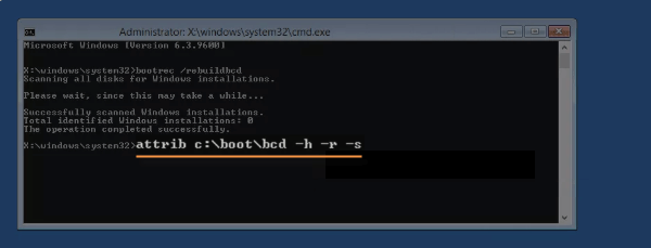 您可能需要調整 BCD 存儲的多個文件屬性,以便可以對其進行操作。在提示符下,執行 attrib 命令,如下所示: