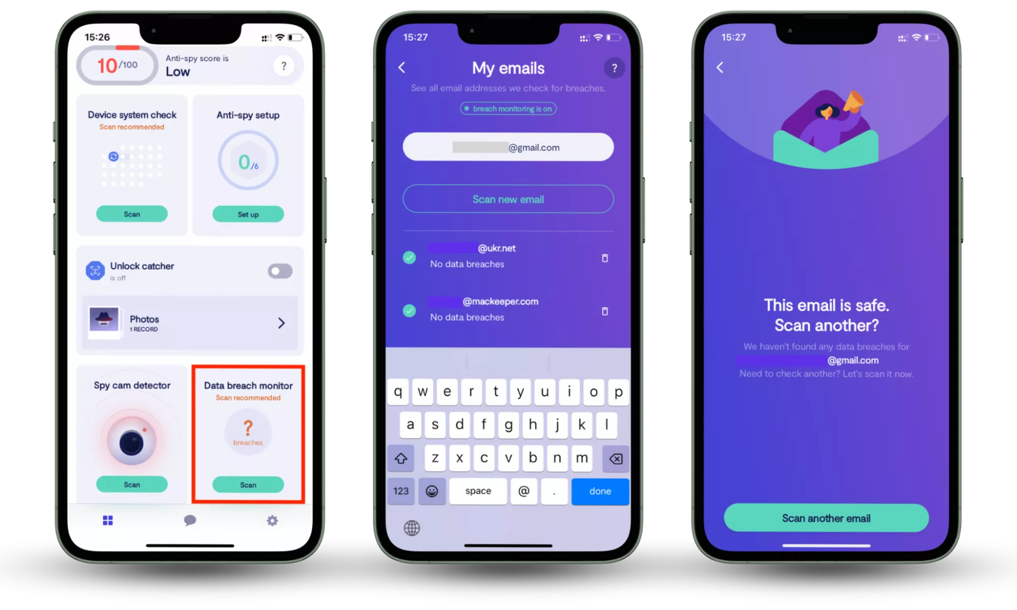 這就是為什麼您應該使用Clario Anti Spy的數據洩露顯示器保護自己免受黑客的侵害。它檢查您的電子郵件或帳戶憑據是否已暴露於數據/服務器漏洞,並讓您迅速採取行動以確保它們。