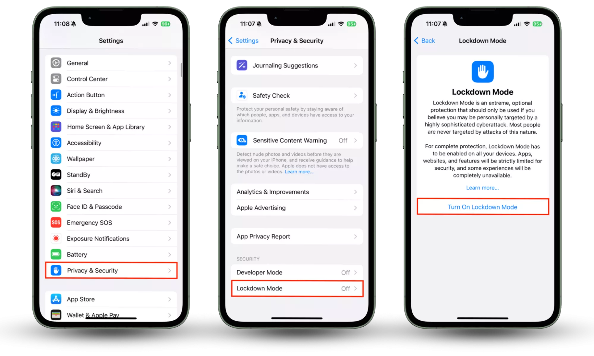 當您的 iPhone 重新啟動時,鎖定模式將處於活動狀態。正如蘋果公司所解釋的那樣,鎖定模式是一種極端保護,主要針對因身份或行為而受到最複雜網絡安全威脅的個人。