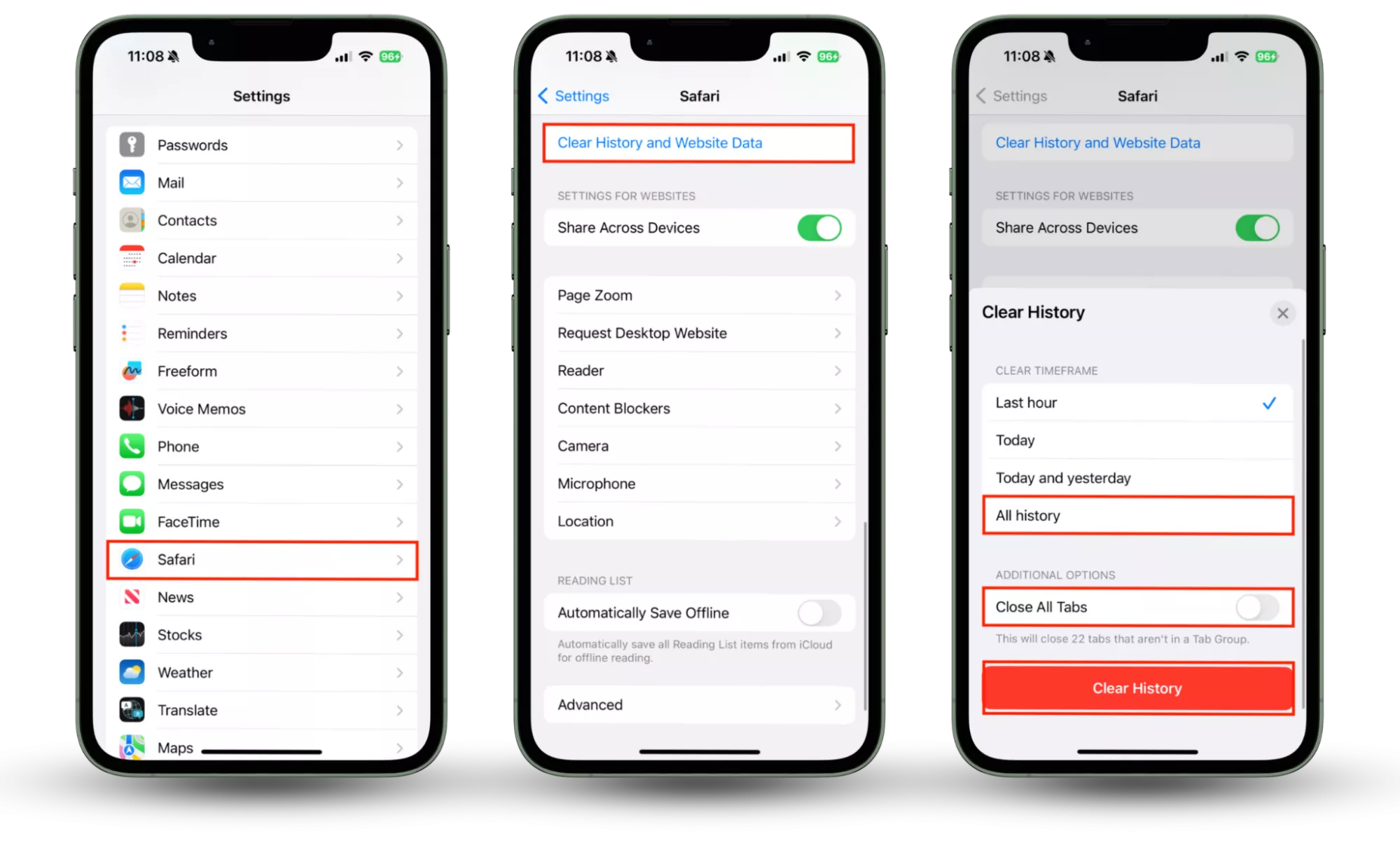 步驟1-3:在“設置”中,點擊Safari,清除所有歷史記錄和網站數據。