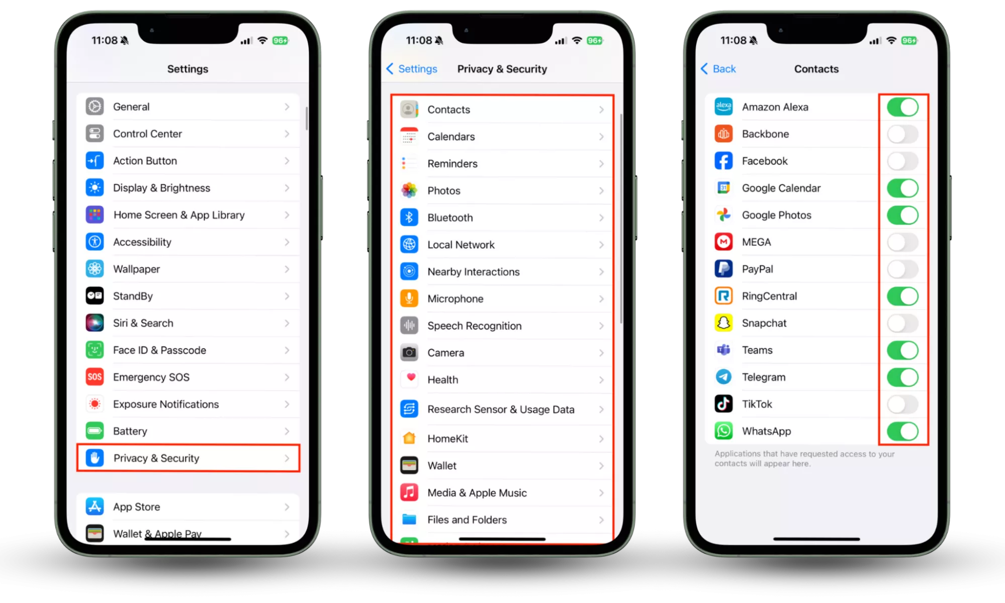 - 在這裡,您將看到 iPhone 上所有權限的列表。點擊其中一個,然後使用每個應用程序旁邊的開關來授予或拒絕對其的訪問。對每個權限重複此過程。