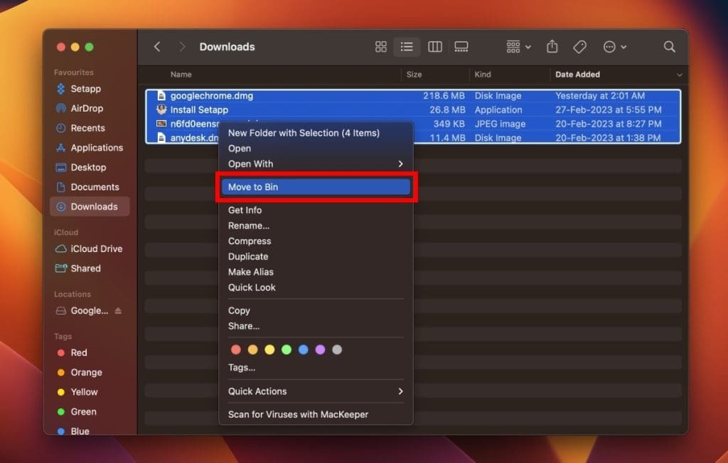 - 選擇您要刪除的文件。您可以將選定的文件拖到 Bin 中或右鍵單擊文件並選擇移至垃圾箱。