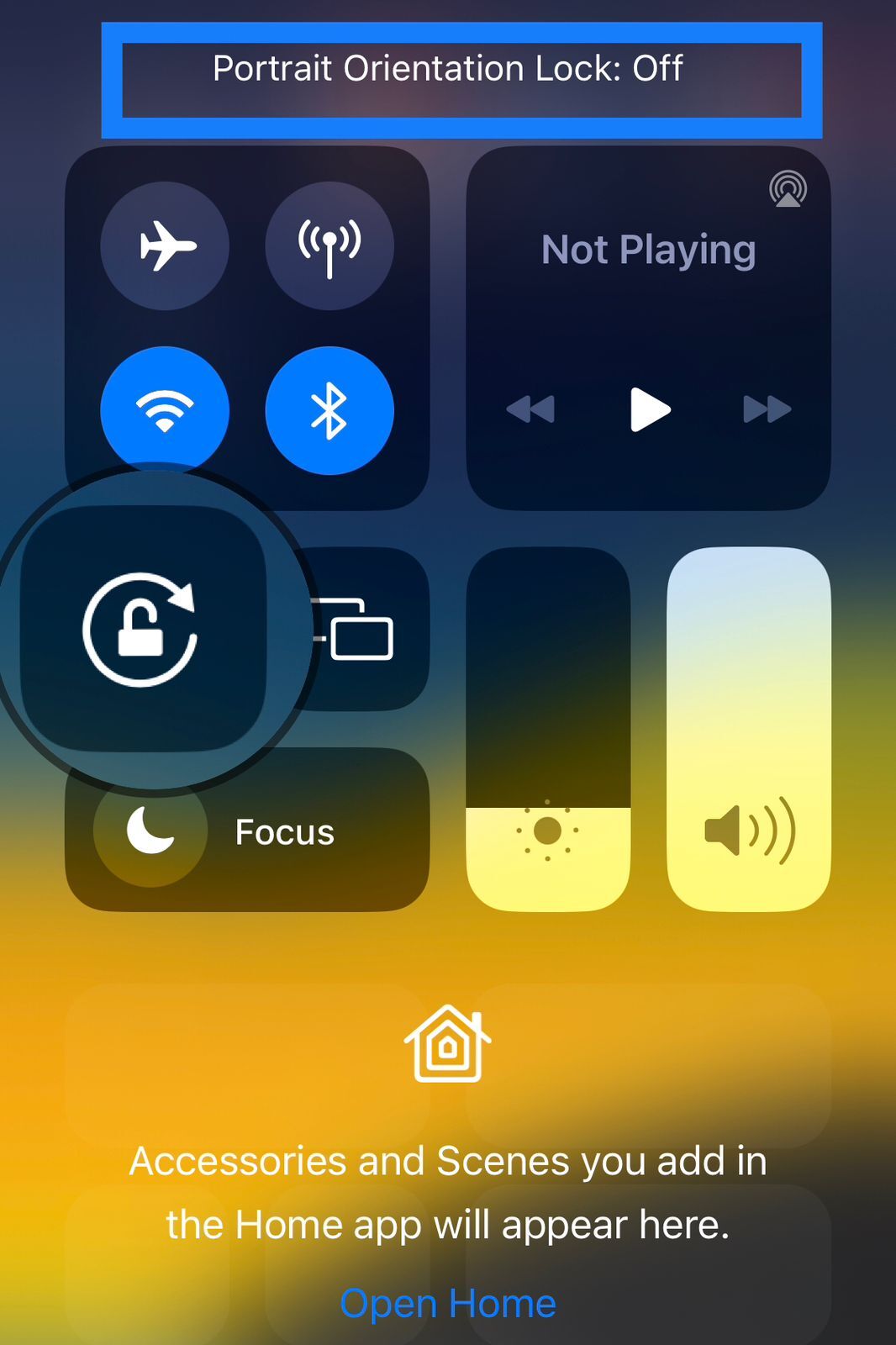 - 在控制中心中查找周圍有圓圈的鎖形圖標。如果啟用縱向方向鎖定,此圖標將顯示為白色背景。要關閉“縱向方向鎖定”,請點擊該按鈕。
