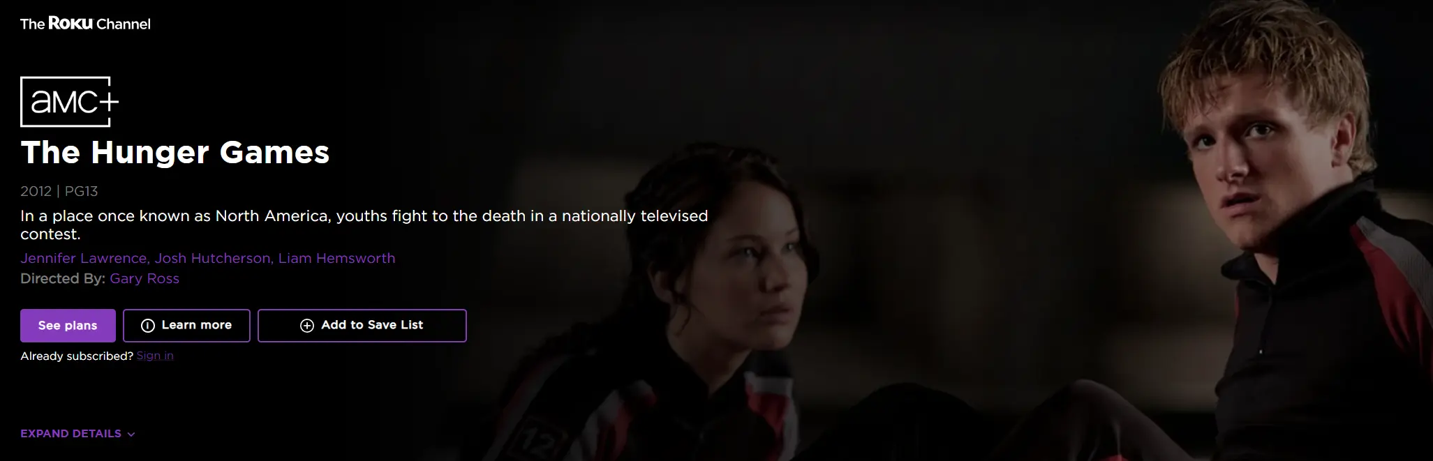 如果你有一個 年設備,那麼您還可以通過 Roku 頻道播放全部四部《飢餓遊戲》電影。該平台混合了免費和付費內容,《飢餓遊戲》電影就屬於後者。