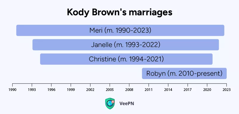該家庭的領導人科迪·布朗(Kody Brown)目前僅與最初的四個姐妹妻子羅賓·布朗(Robyn Brown)之一有關係。克里斯汀·布朗(Christine Brown)是第一個離開的姐姐,在2021年11月透露了她與科迪(Kody)分離。