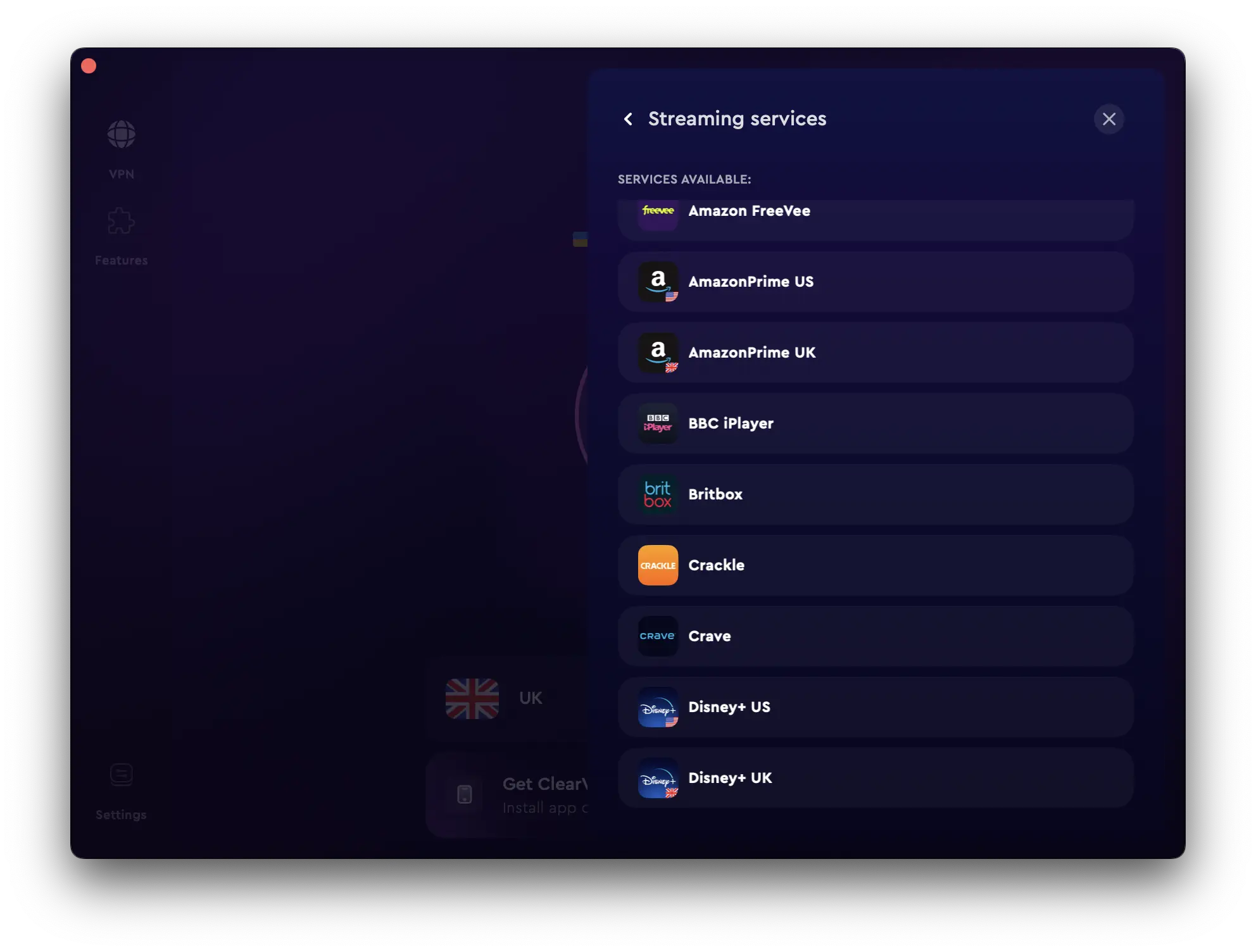 ClearVPN 可在最流行的操作系統和設備上運行,包括 Windows、macOS、iO 和 Android。您所需要做的就是選擇“位置”選項卡中的“流媒體服務”選項卡。