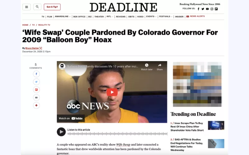 - “氣球男孩”案。赫恩家族被認為是參與換妻活動的最傑出的家庭之一。理查德·希恩 (Richard Heen) 特別喜歡讓他的孩子參與科學實驗。故事在 2009 年 10 月發生了意想不到的轉折,據報導,Heens 6 歲的兒子被困在氦氣球內飛越科羅拉多州。幸運的是,氣球墜落時沒有造成任何傷害,而男孩似乎一直躲在自家的閣樓裡。