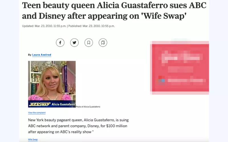 - 對 ABC 提起 1 億美元訴訟。在《換妻》一集中,艾麗西亞·瓜斯塔費羅飾演一個被寵壞的少女,只關心衣服、化妝和髮型。過了一段時間,瓜斯塔費羅想出了一個巨大的1億美元訴訟反對網絡,聲稱她的形像在節目中被誤解,導致欺凌和恐慌發作。這一過程的結果從未被披露。