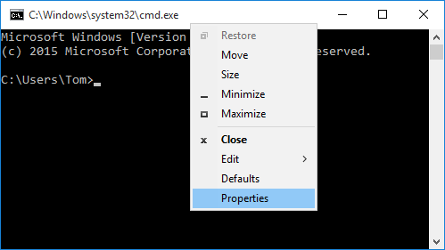 打開命令提示符。右鍵單擊標題欄並選擇特性從打開的上下文菜單中..