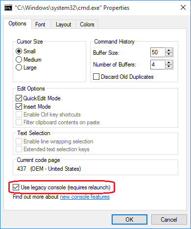 前往選項選項卡,您可以看到一個名為“使用舊版控制台(需要重新啟動)“。在 Windows 10 中,默認啟用新控制台,因此您應該看到“使用舊控制台”選項未選中。