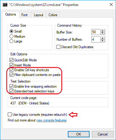 如果您想使用舊的命令提示符,只需取消選中“使用舊版控制台(需要重新啟動)” 選項。啟用舊控制台時,只有兩個編輯選項可用:快速編輯模式、插入模式。要訪問其他編輯選項,例如“啟用新的 Ctrl 鍵快捷鍵”,您必須通過取消選中“來啟用新控制台”使用舊版控制台(需要重新啟動)“ 選項。