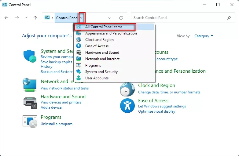 步驟2單擊控制面板旁邊的按鈕,然後選擇所有控制面板項目。