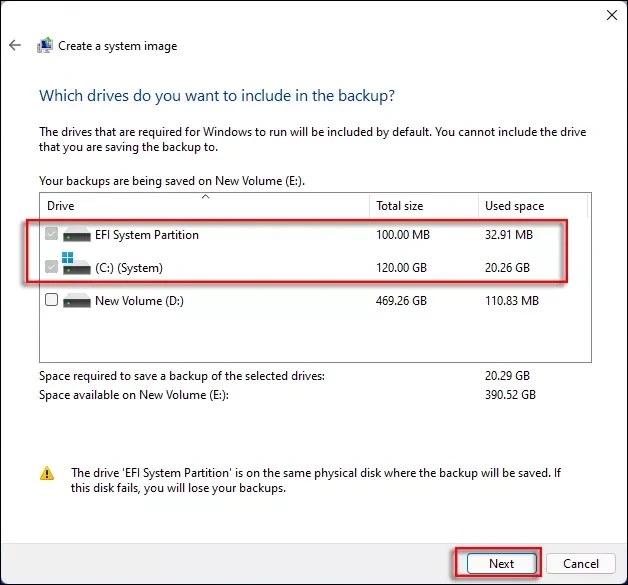 備份文件。然後單擊下一個。 (注意:選定驅動器上的可用空間數量或