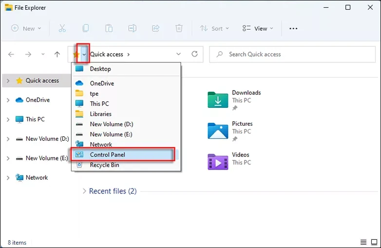 步驟1打開文件資源管理器,然後單擊地址欄上的下拉按鈕,然後選擇
