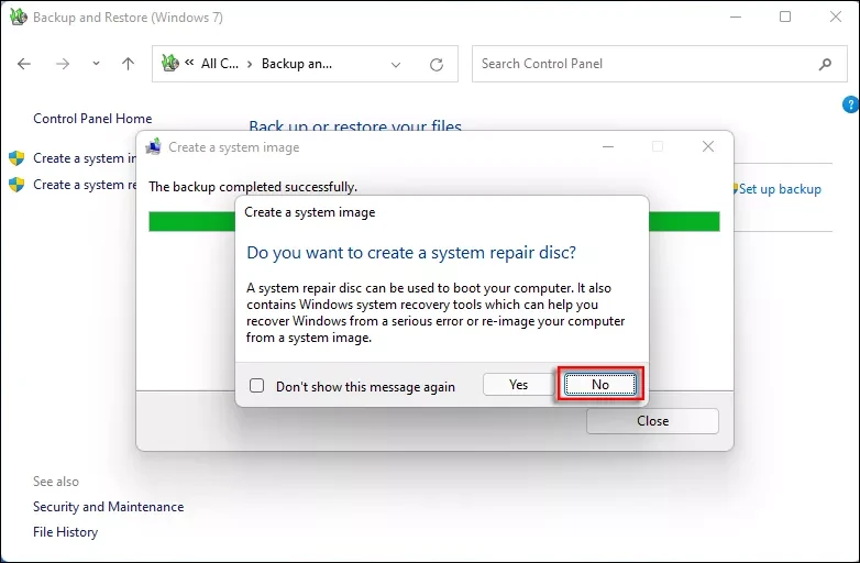 步驟7該程序將開始創建系統備份。如果出現提示框,請選擇