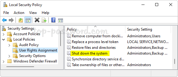 Security Settings -> Local Policies –> User Rights Assignment。在右側窗格中,雙擊名為“關閉系統”。