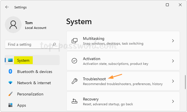 - 按贏+我用於啟動“設置”應用程序的鍵盤快捷鍵。雖然系統在左側欄中選擇類別,單擊故障排除在右側窗格中。