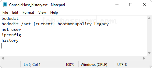 打開ConsoleHost_history.txt使用記事本打開文件,它會顯示您在每個 PowerShell 會話中鍵入的所有命令。