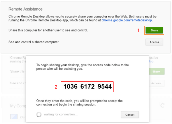 在Mac上,啟動Chrome遠程桌面。點擊開始在遠程協助下,然後單擊分享。它將生成序列號。將代碼發送給您要讓他們使用計算機的人。當對方輸入訪問代碼時,他們會看到您的電子郵件地址並對您的計算機充分控制。