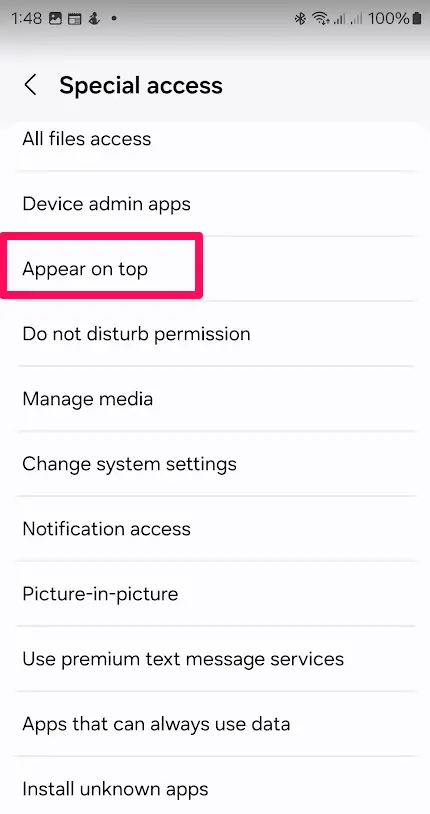 - 接下來,尋找一個名為“在其他應用程序上顯示”或類似內容的選項。三星設備將此選項稱為“顯示在頂部”。