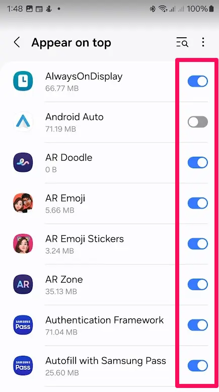 - 在這裡,您將找到已被授予顯示彈出廣告或其他屏幕覆蓋層權限的應用程序列表。只需關閉任何您不想看到通知的應用程序即可。