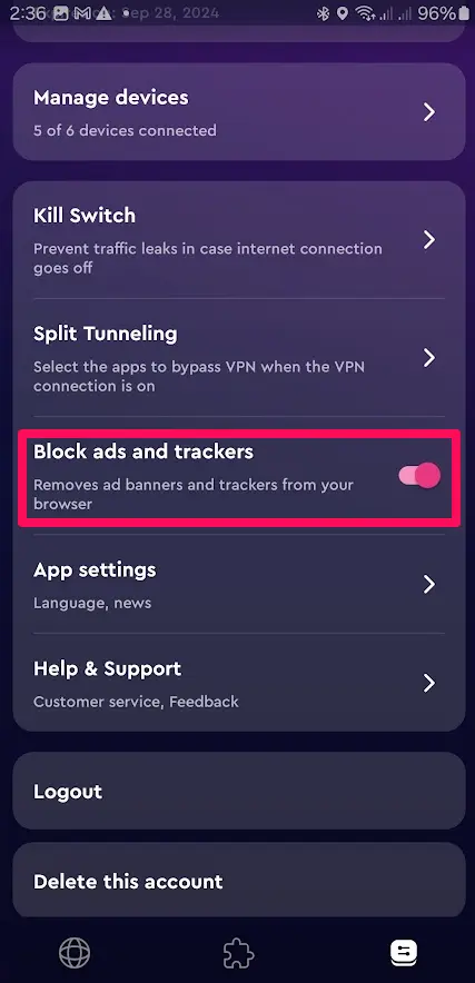 以下是在 ClearVPN 應用程序上啟用廣告攔截功能的方法: