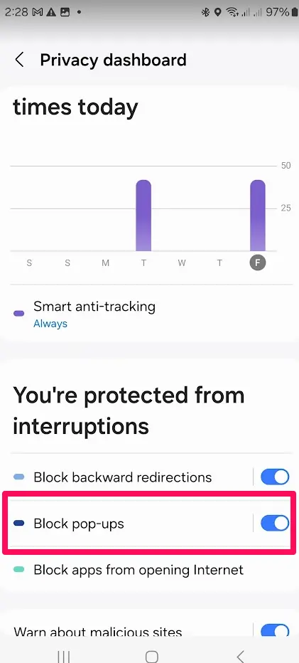 - 在 Samsung Internet 上:點擊右下角的三破折號圖標 > 隱私。只需打開“阻止彈出窗口”旁邊的開關即可。