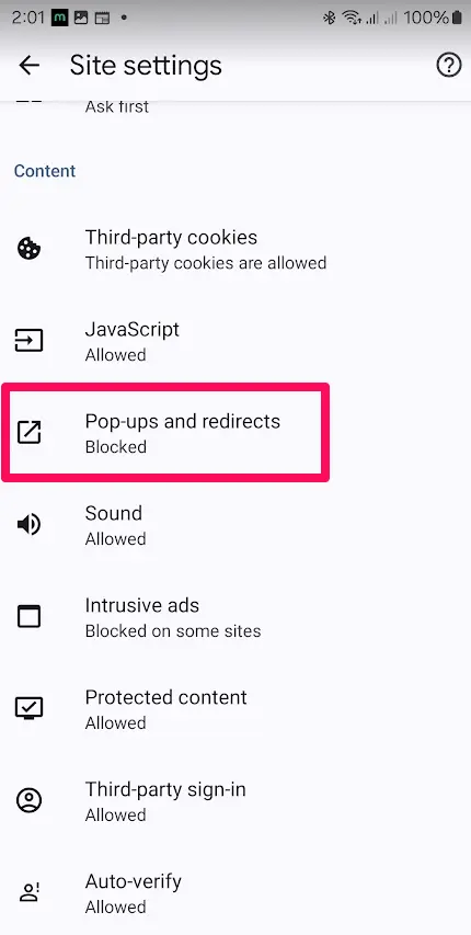 - 在 Google Chrome 上:點擊三點圖標(更多選項)> 設置 > 網站設置 > 彈出窗口和重定向。確保此選項設置為“阻止”。
