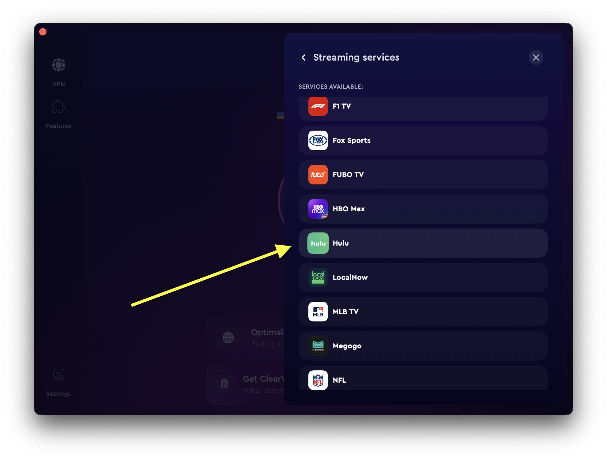 - 選擇您希望取消阻止的流媒體服務(在這種情況下,胡魯)。