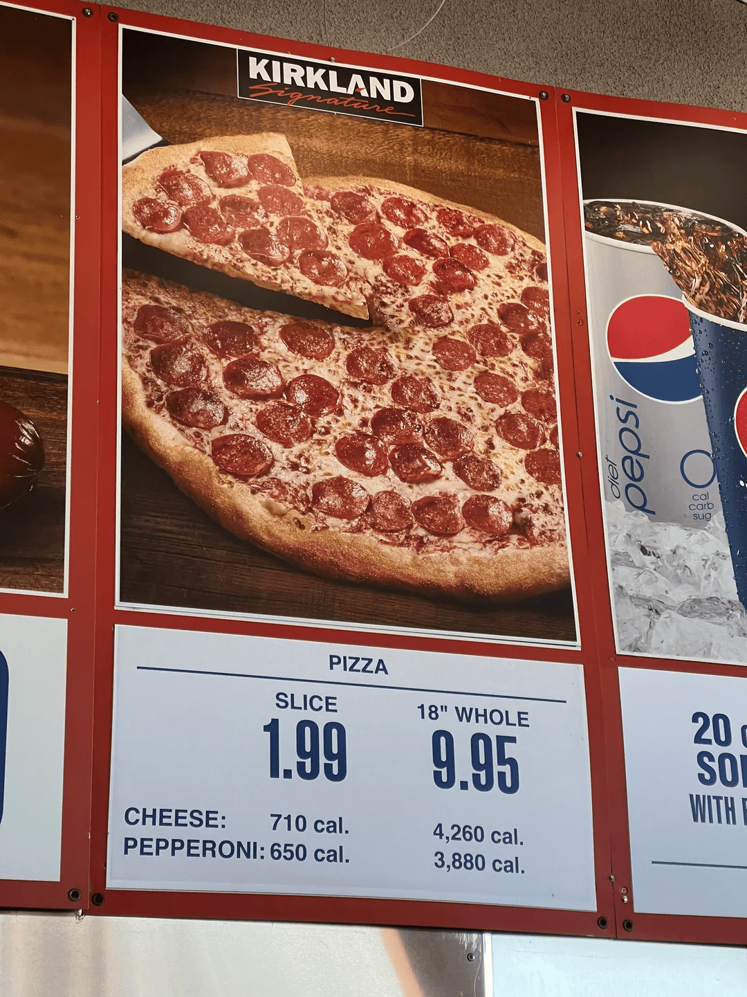 Costco 美食廣場以其便宜的食物而聞名。披薩是菜單上的主要菜品之一。一整個披薩售價 9.95 美元,直徑為 18 英寸。這個尺寸在其他披薩店通常被稱為特大號。