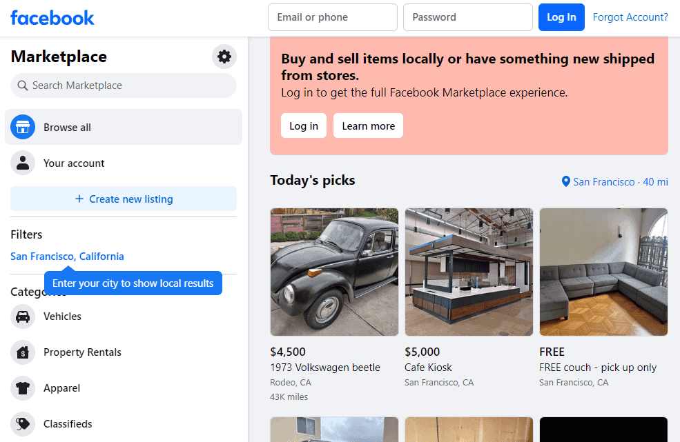 當沒有帳戶的用戶瀏覽 Facebook Marketplace 時,過濾器可以根據特定偏好優化搜索結果。過濾器可能包括家具、電子產品或汽車等類別;價格範圍;或物品狀況,無論是新的還是二手的。