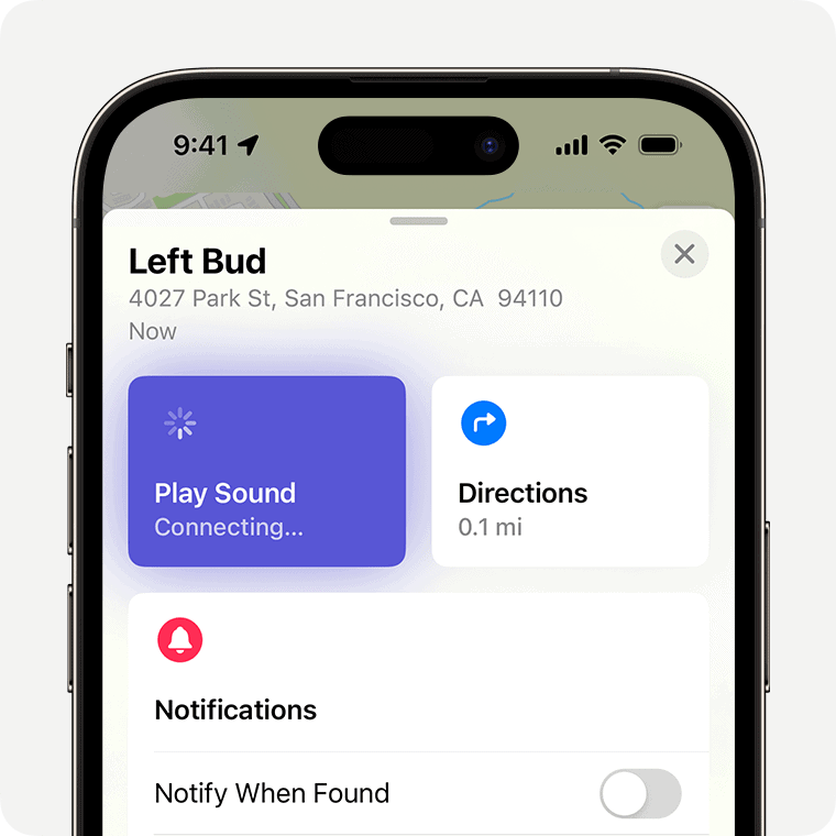 “查找我的”應用程序提供了一個簡單的解決方案來定位附近的 AirPods。用戶可以打開應用程序,選擇他們的AirPods,然後點擊“播放聲音”。此功能會從 AirPods 發出響亮的鳴叫聲,讓您更容易找到它們。聲音的音量逐漸增大,讓用戶有時間找到它們。