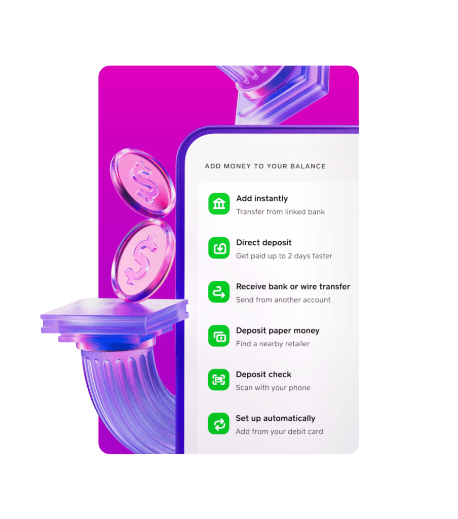 - 存入現金:您可以在參與零售商處或使用 Cash App 存款合作夥伴存入現金。