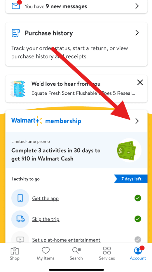 - 轉到沃爾瑪應用程序 > Walmart+ 部分:打開您的沃爾瑪應用程序並查找有關 Walmart+ 的部分。單擊該按鈕可管理您的會員資格。