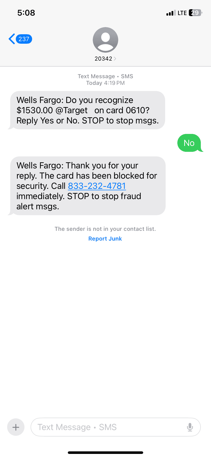 如果您收到文字,並且不確定它是真實的,請致電Wells Fargo。使用卡背面的號碼或訪問他們的網站。不要使用文本中的數字。